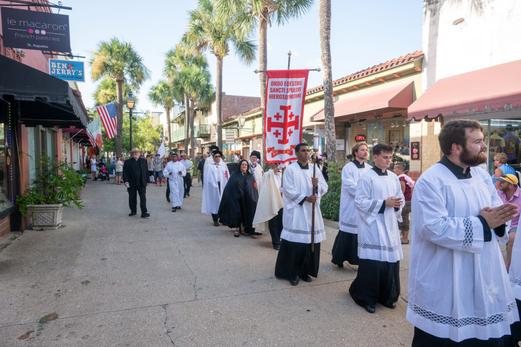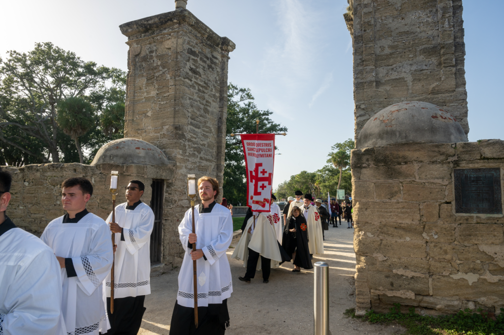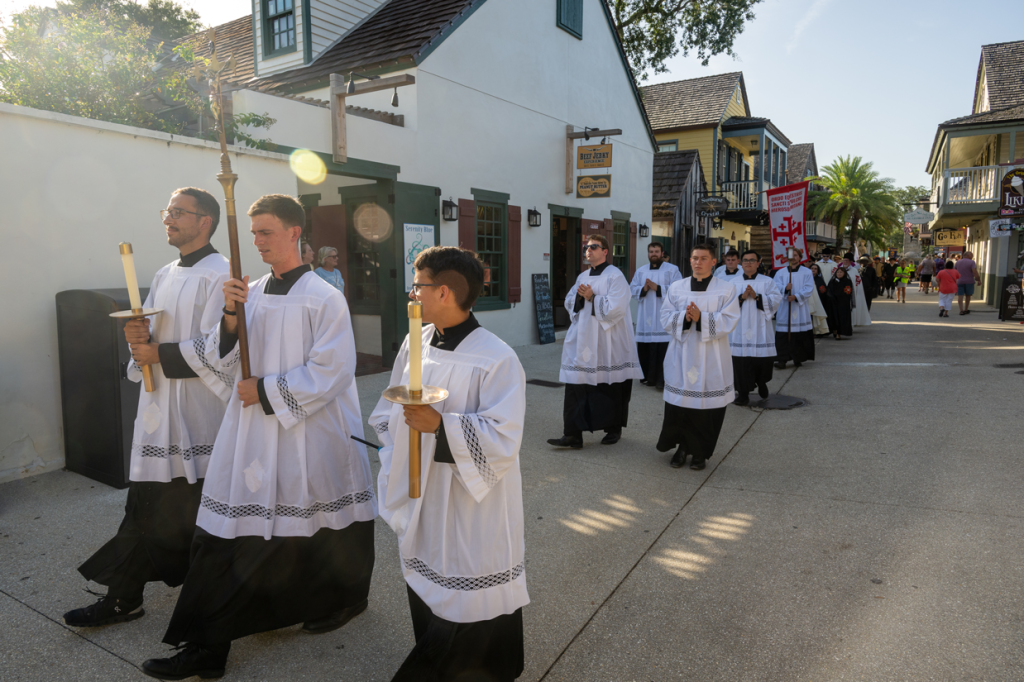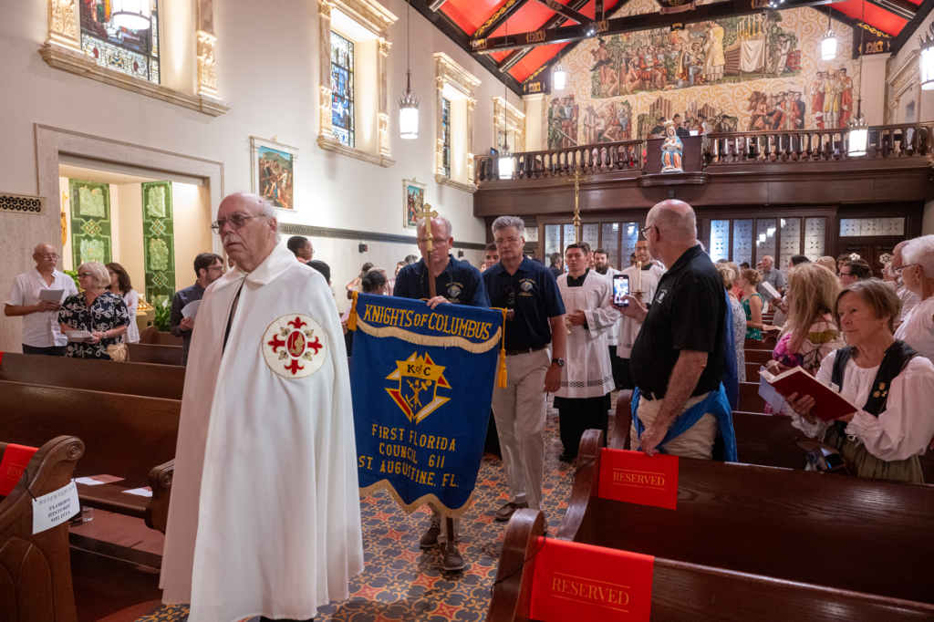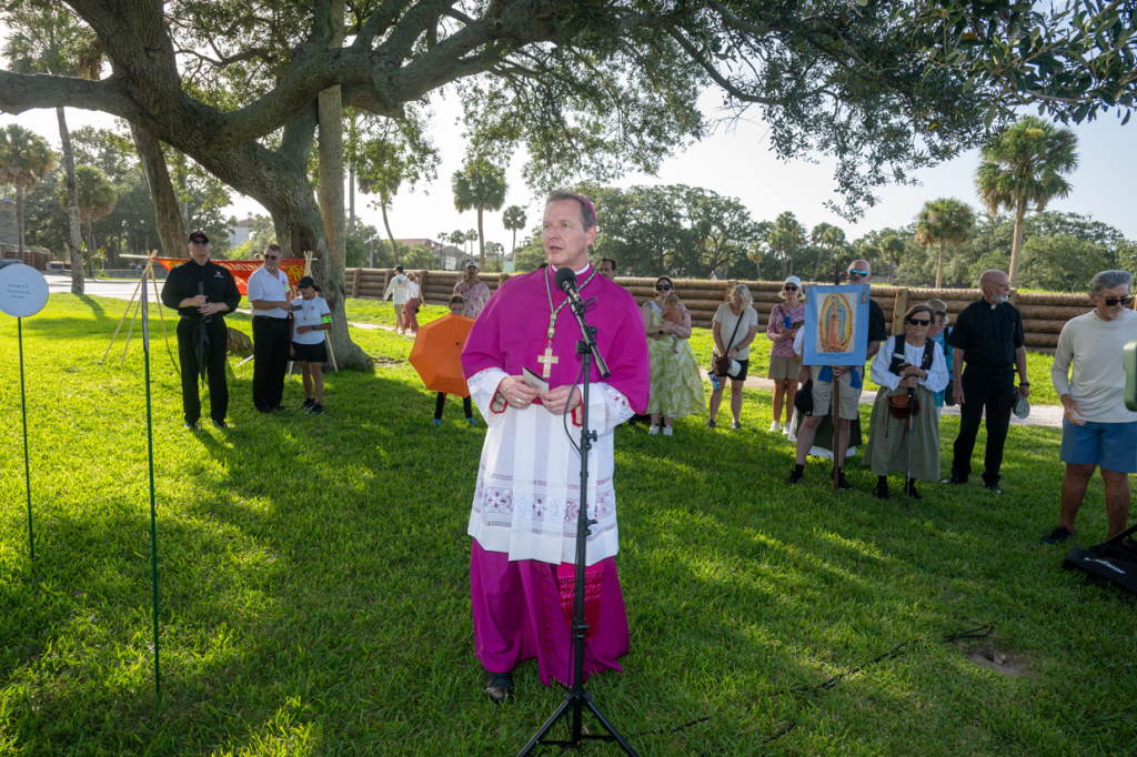 Hosted by the Diocese of St. Augustine and the Cathedral Basilica, the event began at the historic National Shrine of Our Lady of La Leche at Mission Nombre de Dios. There, pilgrims venerated a statue of St. James, which contained relics gifted from Spain, before processing behind the statue along Water Street to the Castillo de San Marcos and then continuing to the Cathedral Basilica of St. Augustine for Mass.