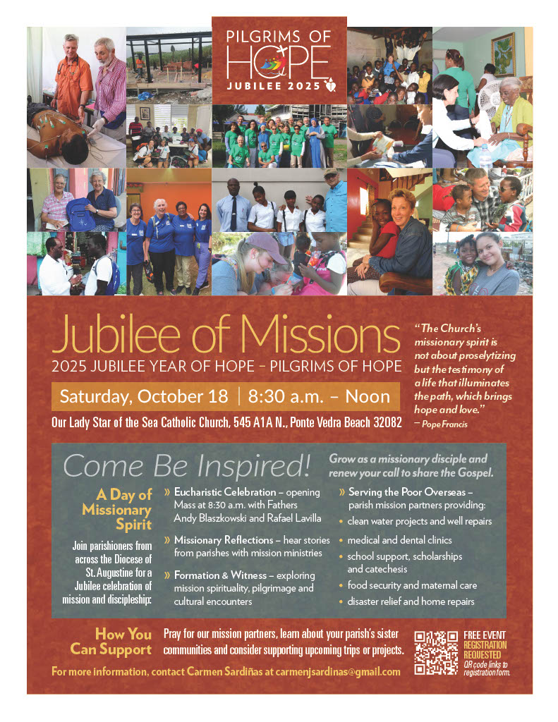 As part of the Jubilee Year of Hope, Our Lady Star of the Sea in Ponte Vedra Beach is coordinating the Jubilee of Missions on Oct. 18 from 8:30 to 11:30 a.m. The morning begins with Mass and includes formation on being a missionary and testimonials from mission participants. Email carmenjsardinas@gmail.com for more details. If you have ever considered joining a mission trip, this event offers a chance to hear firsthand what it’s like to serve abroad.