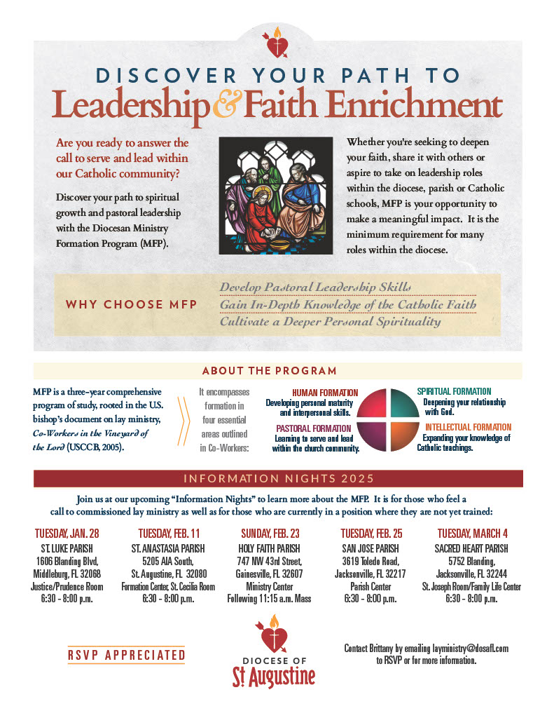 The Diocese of St. Augustine is inviting adults across North Florida to explore the Ministry Formation Program (MFP), a three-year path of study and spiritual growth that prepares lay leaders to serve in parishes and schools. Now in its 34th year, MFP is rooted in Co-Workers in the Vineyard of the Lord and forms participants in four essential dimensions of ministry: spiritual, intellectual, human and pastoral.