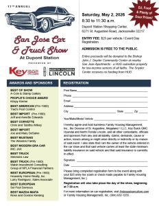 The 11th Annual San Jose Car & Truck Show will be Saturday, May 2 from 8:30 to 11:30 a.m. at Dupont Station Shopping Center, 6271 St. Augustine Road, Jacksonville. Admission is free to the public and $25 for each vehicle entered into the show. The registration form below must be filled out and brought to the event the morning of event with registration beginning at 7:30 a.m. Entry fees can be paid by cash or check made payable to Family Housing Management, Inc.