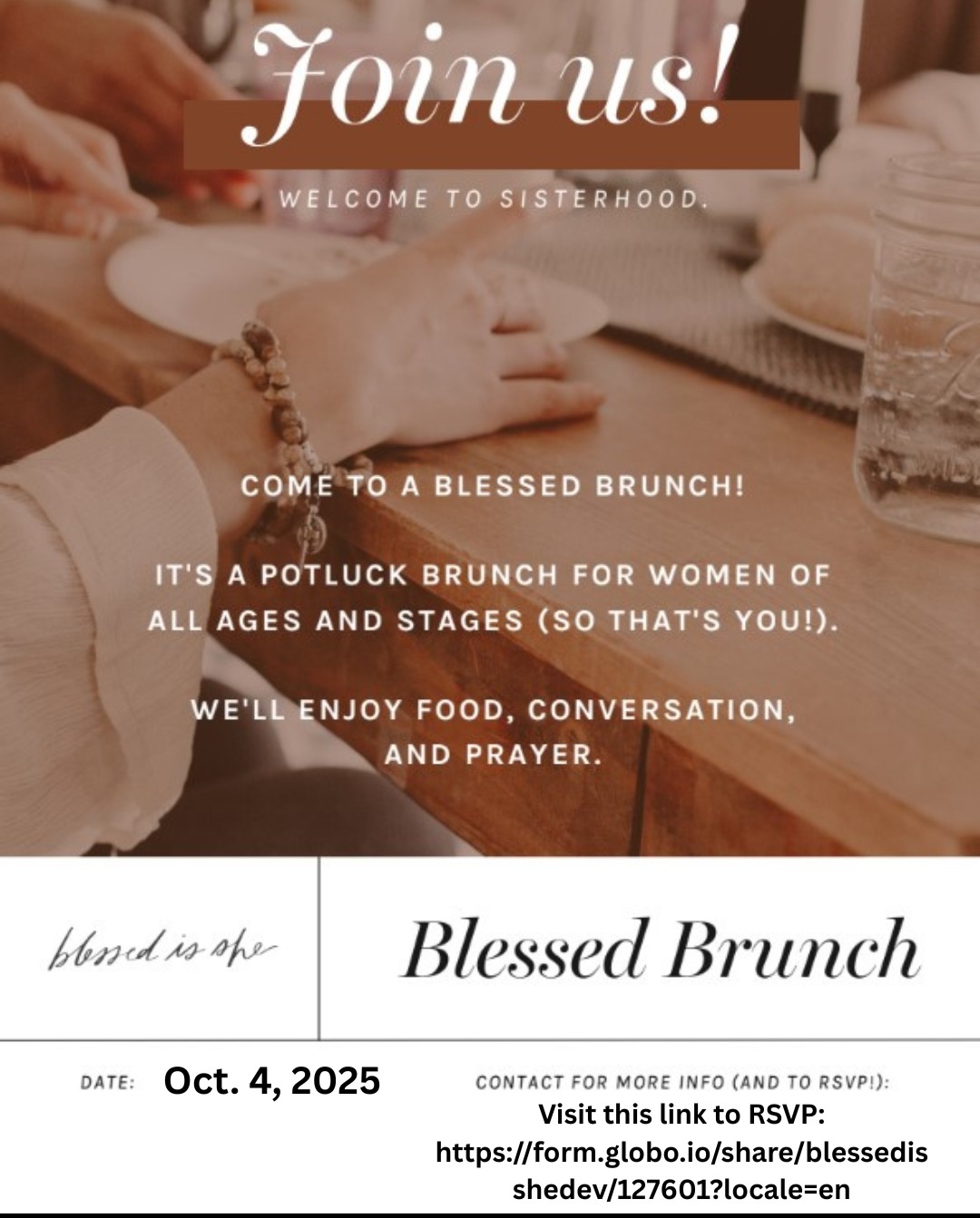 This event is being supported by the Catholic organization, Blessed is She. Women are encouraged by Blessed Is She to host Blessed brunches in their area to help each other grow in their relationship with God. Read more on their About Us page: https://blessedisshe.net/pages/about