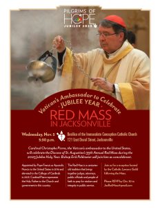 Cardinal Christophe Pierre, Apostolic Nuncio to the United States, will celebrate the Diocese of St. Augustine’s 35th Annual Red Mass on Wednesday, Nov. 5, at 5:30 p.m. at the Basilica of the Immaculate Conception Catholic Church in downtown Jacksonville. Bishop Erik Pohlmeier will join him as concelebrant.