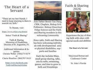 A Faith and Sharing Retreat will be held at the Marywood Retreat and Conference Center in St. Johns on May 18 to 21. Masses will be offered by Bishop Erik Pohlmeier, Bishop Emeritus Felipe Estevez, and Father Bernie Tan Dang, CRM. The retreat will provide spiritual and social experiences in a welcoming community open to all, including people with disabilities. Each day during the four-day retreat will include Mass, small group sharing, arts & crafts, adaptive pool activities, games, nature walks and time to grow in faith and friendships. Contact Sister Rita Baum, SSJ, for more information at 904-826-7365. Messages can be left via voice or text. Below is a brochure for the event.