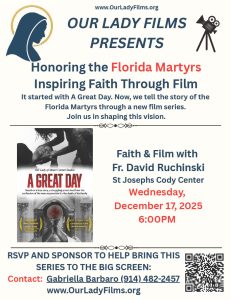 Join us for a special screening of “A Great Day” with Father David Ruchinski at the Cody Center at St. Joseph Parish beginning at 6 p.m. A fundraising reception will follow to support the upcoming Florida Martyrs Film Series. It will be an evening of inspiration, reflection, and community. RSVP and sponsor to help bring that upcoming series to the big screen by contacting Gabriella Barbaro at (914) 482-2457 or by going to www.OurLadyFilms.org.