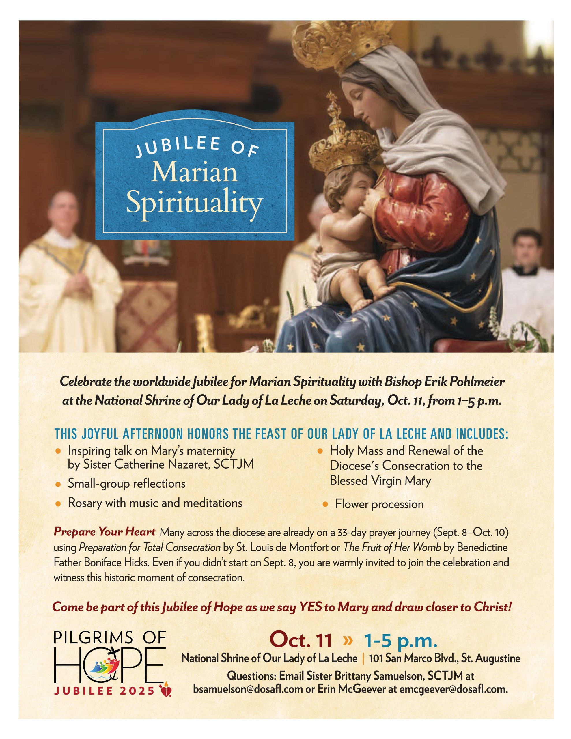 Bishop Erik Pohlmeier invites all to the National Shrine of Our Lady of La Leche on Saturday, Oct. 11, from 1 to 5 p.m. for a Jubilee of Hope celebration. The day coincides with the worldwide Jubilee for Marian Spirituality in Rome and the feast of Our Lady of La Leche. Bishop Pohlmeier will renew the consecration of the Diocese of St. Augustine to Jesus through Mary, first made during the 2021 canonical coronation.