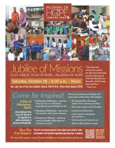 Parishioners across the Diocese of St. Augustine are invited to the Jubilee of Missions on Saturday, Oct. 18, at Our Lady Star of the Sea Catholic Church in Ponte Vedra Beach. The day begins with 8:30 a.m. Mass celebrated by Father Andy Blaszkowski and concelebrated by Father Rafael Lavilla. Part of the 2025 Jubilee Year of Hope, the event features parish mission ministries sharing experiences abroad and formation on pilgrimage, mission spirituality and cultural understanding. Pope Francis reminds us that “the Church’s missionary spirit is not about proselytizing but the testimony of a life that illuminates the path, which brings hope and love.” Be inspired to grow in missionary discipleship and evangelization. For details, email Carmen Sardiñas at carmenjsardinas@gmail.com. To download an event flyer with more details, click here.