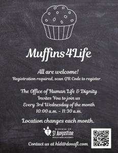 Muffins4Life brings together life-affirming organizations and individuals in the pro-life ministry to open communication channels among participants over a great muffin! This month’s event will be on Wednesday, Nov. 19 at St. Gerard Campus located at 1405 U.S. 1 in St. Augustine and our guest speaker is Nancy Basham, executive director of Women’s Help Center in Jacksonville. It will be from 10 to 11:30 a.m. and registration is mandatory as space is limited. Use the QR Code on the flyer below to register. For more information, email hld@dosafl.com.