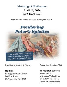 A morning of reflection at the Sisters of St. Joseph Motherhouse in St. Augustine will be held April 18 from 9 to 11:30 a.m. with breakfast snacks available prior beginning at 8:15 a.m. Participants will engage in the Epistles of St. Peter during a morning of reflection. A donation of $20 is appreciated to attend. To register contact Sister Jane at sjstoecker63@ssjfl.org or call 904-325-3361.