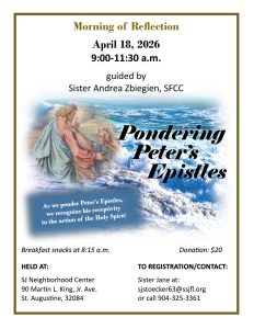 The Sisters of St. Joseph are offering a morning of reflection entitled “Pondering Peter’s Epistles” on April 18 from 9-11:30 a.m. Sister Andrea Zbiegien, SFCC, will guide you through these reflections. The day will be held at St. Joseph Neighborhood Center, 90 MLK, Jr. Ave. in St. Augustine. Breakfast snacks will be available at 8:15 a.m. To register email Sister Jane at sjstoecker63@ssjfl.org. View the flyer below.