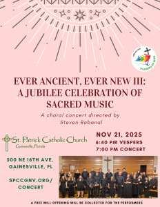 The November concert at St. Patrick Catholic Church in Gainesville is called Ever Ancient, Ever New 2025: A Jubilee Celebration of Sacred Music with guest director Steven Rabanal, the director of music at St. Joseph Catholic Church in Orlando. Join us on Friday, Nov. 21 for a Jubilee celebration of Catholic chant and polyphony from the past two centuries, sung by a 30-person choir. This concert will be performed by a group of parish music directors, church singers, musicians, and composers from throughout North-Central Florida who are passionate about sacred music and celebrating its role in the life and liturgy of the church. In Ever Ancient, Ever New, historical and contemporary musicians will lend their gifts to praise, worship, and spreading the joy of the faith. Vespers will begin at 6:40 p.m. and the concert will follow at 7 p.m. A free-will offering will be collected for the performers.