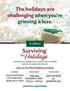 The Holidays can be tough when grieving, after the loss of a loved one. Join us for a two-hour seminar from 10 a.m. to noon on Saturday, Nov. 8 at the Cody Enrichment Center located at 4152 Loretto Road in Jacksonville. The seminar will provide advice and support to help cope during the holiday season. For more information, call (904) 318-9308 or go to griefshare.org/holidays.