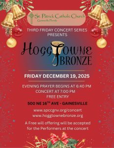 Hoggtowne Bronxe will be the featured musical act during St. Patrick Catholic Church’s Third Friday Concert Series on Dec. 19. The night will begin at 6:40 p.m. with evening prayer and the concert will follow at 7 p.m. Entry to the concert is free, but a free-will offering will be accepted to go to the performers. St. Patrick Catholic Church is located at 500 Northeast 16th Ave. in Gainesville. For more information contact Robin Beutler at rbeutler@spccgnv.org