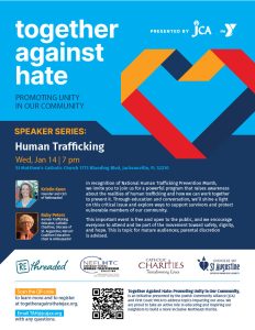 Together Against Hate: Promoting unity in our community, is an initiative presented by the Jewish Community Assiance (JCA) and First Coast YMCA to address topics impacting our area during National Human Trafficking Prevention Month. It is a powerful program that raises awareness about the realities of human trafficking and how we can work together to prevent it. The event will be at St. Matthew Catholic Church, located at 1773 Blanding Blvd. in Jacksonville. The featured speakers will be Kristin Keen, founder and CEO of Rethreaded and Ruby Peters, human trafficking educator with Catholic Charities and the Diocese of St. Augustine.