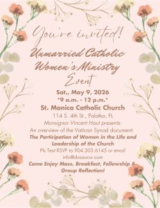 The event will begin with Mass, followed by breakfast, and then a presentation from Monsignor Vincent Haut on the Vatican Synod document regarding the Participation of Women in the Life and Leadership of the Church. Reflection and small group sharing on the document will also be part of the event. This month’s event will be from 9 a.m. to noon at St. Monica Catholic Church, 114 S. 4th St., Palatka, Fla. The purpose of the ministry is to bring Catholic women, single, divorced, separated or widowed, together and closer to God through Bible study. Although the event is free to attend, an RSVP is encouraged by texting (904) 303-6145 or emailing info@dosaucw.com.