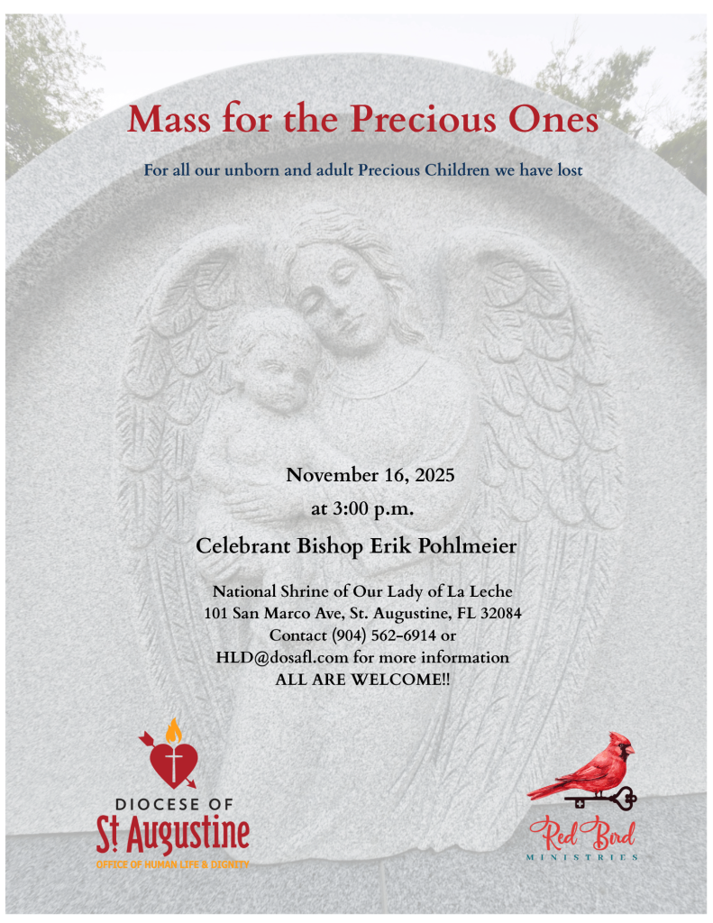 Each year, the Office of Human Life and Dignity hosts a Mass for families of “precious ones” following a loss through miscarriage, child loss in adulthood or following a healing program after an abortion. All are welcome to attend. These Masses are held in November to remember Holy Souls at the National Shrine of Our Lady of La Leche in St. Augustine and the Santa Fe Shrine of Our Lady of La Leche in High Springs.