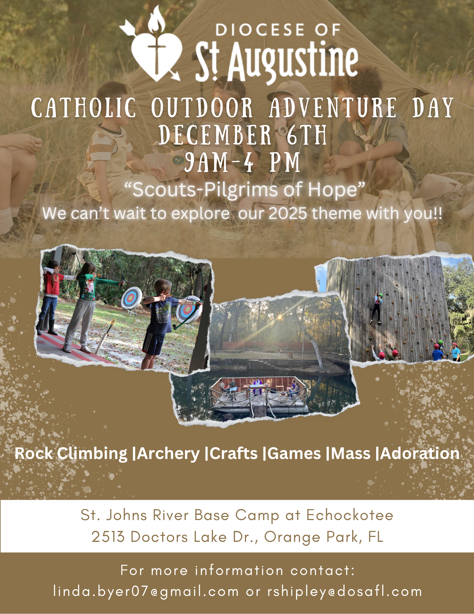 Save the date for Saturday, December 7, 2024, for the annual Scout Retreat- Catholic Outdoor Adventure Day (COAD) which is filled with family activities that include climbing, archery, BB guns, crafts, large than life games and more – all while learning about our Catholic faith. Sign up to volunteer or register: